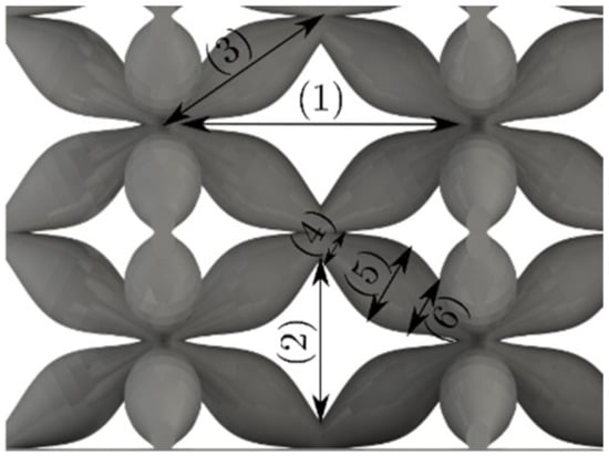 The UPLS fabricated by FFF and LCD were further inspected using a ZEIN microscope to contrast them with their computational model versions. The length of the spaces between unit cells were measured, i.e., horizontal (1) and vertical (2) directions, the length of the struts (3), and their diameter in three regions, i.e., at the end (4), at the center (5) and the beginning (6) of the strut were measured. Figure 7 shows the regions where the struts were measured.