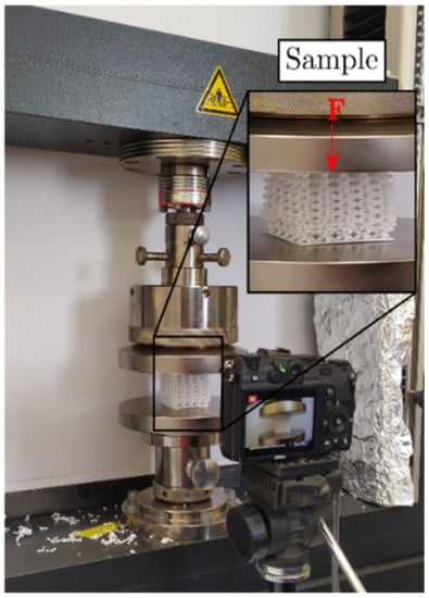Quasi-static compression tests were carried out to evaluate the mechanical properties of the designed structures with a ZWICK® Z-050 machine at room temperature. The test speed was mm/min, using two plates with a diameter of mm; also, as shown in Figure 8, a NIKON® (Melville, NY, USA) P7000 camera was used to capture the deformation of the lattice structure during the test.