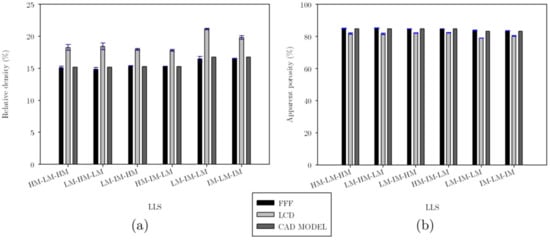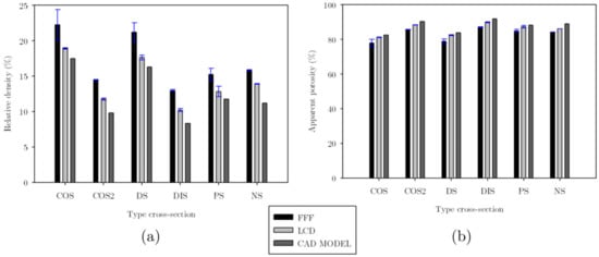 The structures manufactured in LCD resulted in a relative density closer to that of the CAD model, as shown in Figure 9a. The FFF structures had considerably noticeable defects (accumulation of material in the connections and the narrow areas of the struts), and due to these defects inherent to the printing process showed a more significant discrepancy in relative density concerning computational models. Additionally, the apparent porosity is calculated and plotted in Figure 9b.