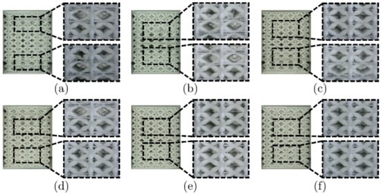 LLS printed via FFF: (a) HM-LM-HM, (b) LM-HM-LM, (c) HM-IM-LM, (d) LM-IM-HM, (e) LM-IM-LM and (f) IM-LM-IM.