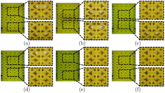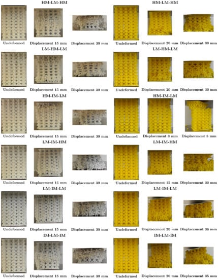 In the structures manufactured with FFF and LCD, failure started in the area where COS was located because it had the lowest strength. The structures in Figure 20a,b contain NS, the maximum load (524.6 and 642.4 N, respectively) in these structures occurred at mm displacement, COS was completely densified, and NS began to deform (see Figure 21). HM-IM-LM (Figure 20c) and LM-IM-HM (Figure 20d) structures started to fail in the COS zone followed by DS, at mm these unit cells densified and NS began to deform (see Figure 21). The LM-IM-LM structure is shown in Figure 20e; in this structure the COS unit cells were compressed to mm displacement, and the structure had a more uniform deformation than the rest of the structures (see Figure 21). The central zone of the IM-LM-IM structure started to deform at 15 mm (see Figure 20f), and at mm of displacement this zone was completely densified.
