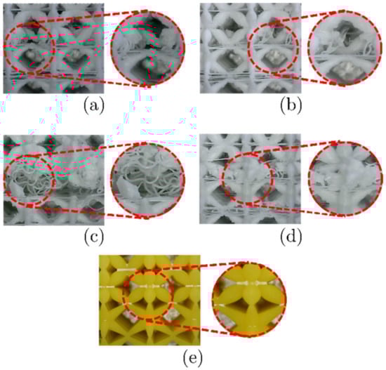 Print defects in LLS with PS and COS unit cells: (a) no connection in struts, (b) absence of struts, (c) absence of unit cells, (d) accumulation of material, and (e) connection in LCD structure.