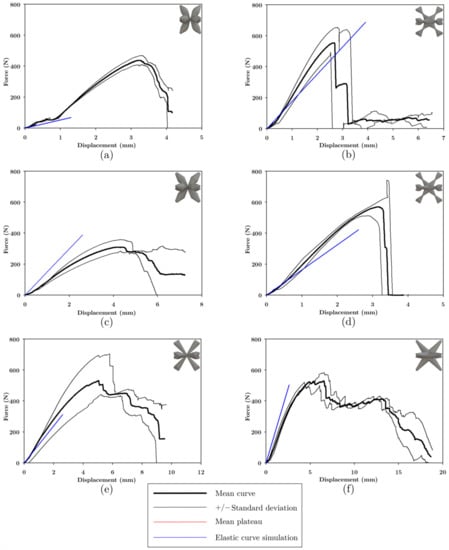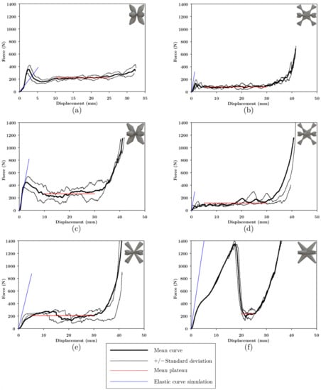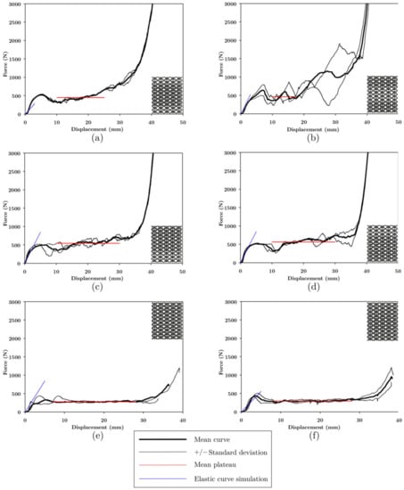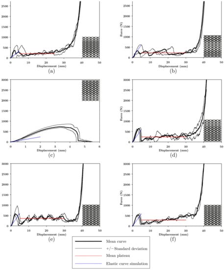 The plateau of the structures had small steps due to the rupture of the zones of the structure at different magnitudes of displacement, and the densification of the structures occurred approximately at mm of displacement. Two slopes were observed in the elastic zone, and the simulation prediction resembles the first curve. This zone was considered in the comparison between the simulation and experimental results, presented in Figure 23c and 23d, respectively.