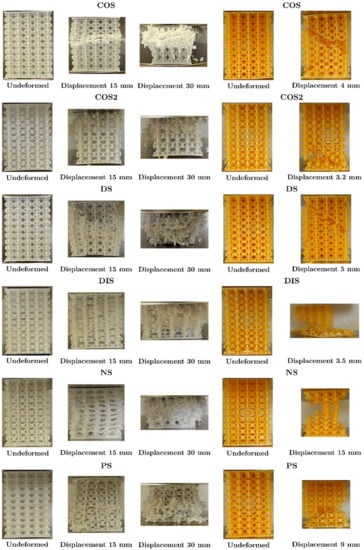 In Figure 16a, the maximum load for the COS lattice structure occurred at a displacement of approximately mm; this structure started to fail at its central layer with the collapse of the unit cells, the central unit cells began to collapse (see Figure 17), and the upper and lower cells were still intact at the beginning of densification.