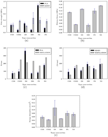 Figure 19b shows the plateau stress for the structures printed via FFF; it can be seen that COS, DS, NS, and PS resulted in similar plateau stress between MPa and MPa. The COS2 and DIS structures were the ones that presented the lowest plateau stress.