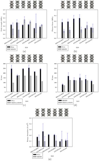 As mentioned above, the plateau in the LLS presented staggering due to the fracture of the zones of the structure at different magnitudes of displacement. COS, DS, and NS structures presented plateau stress of MPa, MPa, and MPa, respectively, while for the LLS structures, their plateau stress was between MPa to MPa, as shown in Figure 23b, which indicates an increase when unit cells with different stiffness and strength were combined. For the resin structures, the combination of COS, DS, and NS allowed for a plateau during the deformation and densification in most of the LLS; due to the rupture by zones of the structure, the LLS that did not present a plateau or densification was HM-IM-LM because only the upper part of the structure has the COS variation.