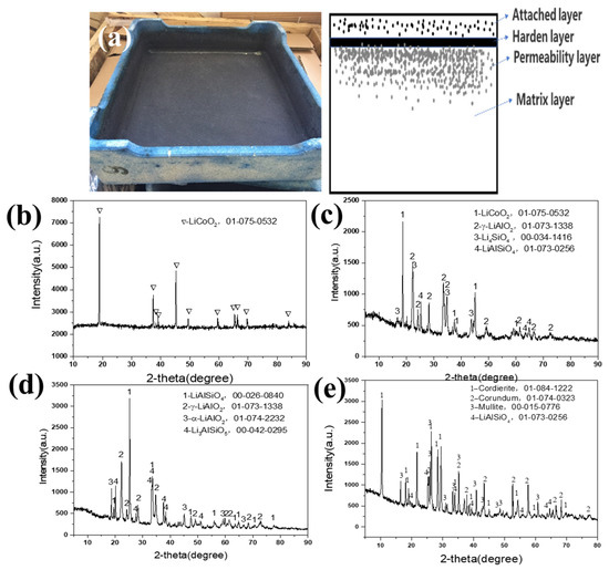 XRD patterns of different regions of waste saggar produced during the synthesis of LiCoO2 cathode material. (a) Photo of real waste saggar and a section diagrammatic drawing; (b) XRD pattern of the attached layer; (c) XRD pattern of the hardened layer; (d) XRD pattern of the permeability layer; (e) XRD pattern of the matrix layer.