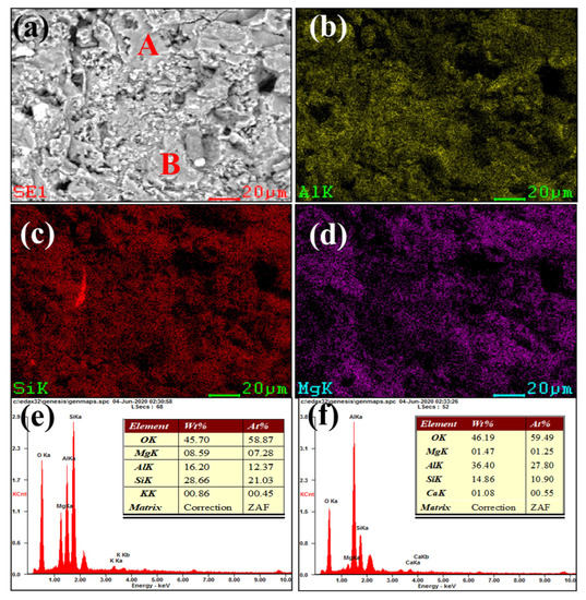 SEM and EDS mapping photos of a section of new saggar. (a) SEM image of a sample magnified 1600 times; (b), (c), and (d) EDS mappings of Al, Si, and Mg elements, respectively, in (a). (e) and (f) EDS images of positions A and B, respectively (a).