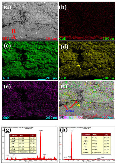 Figure 3 and Figure 4 show our microstructural and elemental distribution analysis of the internal and corrosion interface of new saggar and waste saggar, respectively. We found that the structure was relatively uniform, with massive aggregate closely combined with the reaction material. A small amount of silicon was enriched, and most of the silicon was positively correlated with aluminum and magnesium. Our results show that aluminum and silicon are enriched in some regions, and aluminum, silicon, and magnesium are basically uniformly distributed. For example, position A in Figure 3a shows the enrichment of aluminum, silicon, and magnesium elements, which may be a cordierite phase according to our XRD analysis results; position B is mainly enriched with aluminum and silicon elements (Figure 3f), which may be a mullite phase according to our XRD analysis results. In addition, a small amount of silicon and aluminum show separate enrichment, possibly related to a small amount of quartz and corundum phases. Figure 4 shows that reaction layers can be found on the ceramic surface after the high-temperature sintering reaction, with cracks generated between the body and the reaction layers, possibly because of the phase volume expansion before and after the reaction. According to the elemental distribution of cobalt, aluminum, silicon, and magnesium, cobalt is mainly concentrated on the surface of the attachment layer and is the product of the reaction of Li2CO3 and Co3O4 with ceramics during the preparation of the LiCoO2 cathode material. As shown in Figure 4b,g, we observed very high cobalt content, indicating that the erosion of cobalt mainly occurs in the surface area, with cobalt struggling to penetrate into the ceramic body. According to Figure 4h, position B primarily consists of silicon, with low cobalt, aluminum and magnesium contents, which may be a generated lithium silicate phase according to our XRD analysis results. Our SEM-EDS analysis results show that the depth of the corrosion layers ranges from 200 to 500 μm. Our results also show that the oxide permeability of cobalt is poor, whereas the changes in the internal silicon and aluminum indicate that an internal high-temperature reaction also occurred.