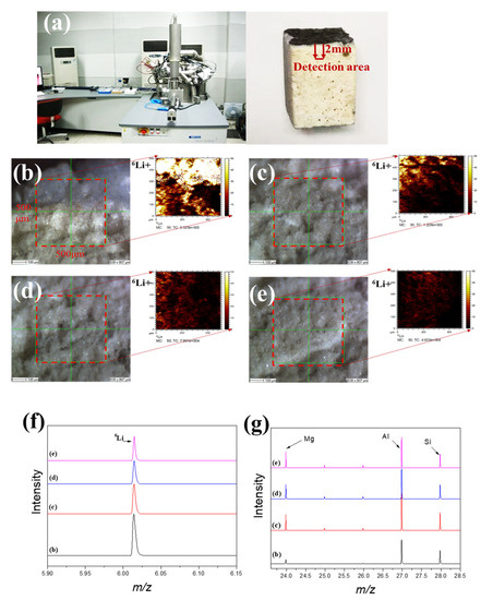 TOF-SIMS lithium permeation analysis of waste saggar. (a) TOF-SIMS instrument and analysis sample; (b–e) local scanning images and lithium intensity distribution maps, respectively, obtained from the surface of the adhesive layer of waste saggar in a scanning analysis area of 500 μm × 500 μm. (f) and (g) Relative content changes in Li, Al, Si, and Mg in four different regions of b, c, d, and e, respectively.
