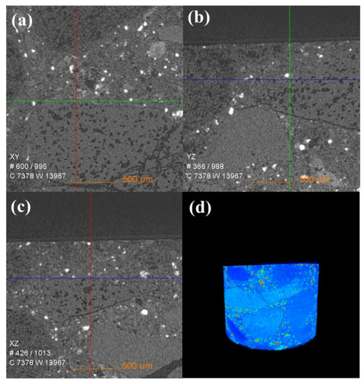 X-ray CT of a waste saggar sample. (a), (b), and (c) Internal X-ray CT figures of a waste saggar sample scanned from the XY, YZ, and XZ directions, respectively. (d) Three-dimensional image in which bright and dark colors represent high and low density, respectively.