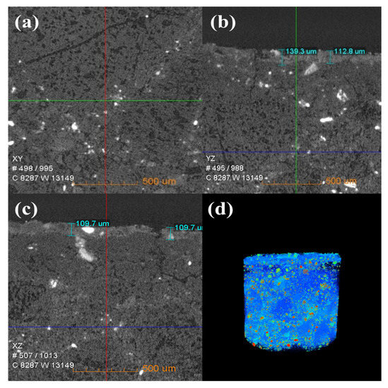 Figure 6 shows the change in the internal density of new saggar and waste saggar characterized by X-ray CT analysis to further clarify the changes in the internal structure of the saggar before and after sintering. The bulk densities of cordierite, mullite, and corundum were 2.51 g/cm3, 3.156 g/cm3, and 3.5 g/cm3, respectively. Figure 6 shows that according to the XRD analysis results of new saggar, mullite and corundum aggregates were distributed in the interior of the phase as support, and fine alumina and cordierite were distributed between the aggregates as a binder phase. We also observed fine voids at the edge of auxiliary materials. In the cylinder section, except for the difference in aggregate density, the distribution of other dispersions in the ceramic was relatively uniform. Figure 7 shows the internal X-ray CT structure of the spent saggar obtained after sintering the LiCoO2 cathode material. A density-difference layer occurs on the contact surface between the saggar ceramic surface and the cathode material after the reaction. In the YZ and XZ surfaces, the thickness of the erosion reaction layer is approximately 110–140 μm, and many cracks can be found in the internal aggregate at the interface. This phenomenon is mainly due to the inconsistent expansion coefficient of lithium carbonate with mullite, cordierite, corundum, and other phases before and after reaction at high temperature. As a result, the thermal expansion coefficients of LiAlO2, LiAlSiO4, and Li4SiO4 were relatively large, leading to surface expansion and a large number of microcracks. The densities of LiAlO2, LiAlSiO4, and Li4SiO4 are 2.615 g/cm3 [19], 2.67 g/cm3 [20], and 2.35 g/cm3 [21], respectively, which are lower than those of mullite and corundum. Three-dimensional simulation images revealed that an erosion layer formed at the interface because of LiCoO2 and cobalt aluminate. The density of the part between the erosion and bulk layer was reduced due to the deep reaction of lithium, resulting in the formation of a low-density permeable reaction layer. Volume change in different areas caused by density change is one of the key reasons for saggar peeling or cracking.
