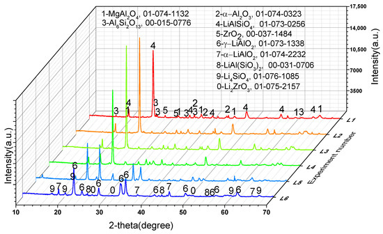 To further confirm the phase transformation mechanism of the reaction process, we designed experiments on the reaction of Li2CO3 or Co3O4 with the crushed saggar powder to investigate the erosion mechanism. Figure 8 shows that when the consumption of lithium carbonate was low (experiment L1; Li2CO3: saggar powder mass ratio, 1:1), the reaction products were mainly LiAlSiO4, and the remaining phases were mainly unreacted mullite, cordierite, and corundum. We also found small amounts of Li4SiO4, ZrO2, and magnesium aluminum spinel in the product. With an increase in Li2CO3 consumption, the product’s content of lithium aluminosilicate gradually decreased, whereas that of γ-LiAlO2 and Li4SiO4 gradually increased. When lithium carbonate consumption was higher than the mass of saggar powder (experiment L6; Li2CO3: saggar powder mass ratio, 6:1), the reaction products were mainly γ-LiAlO2 and Li4SiO4, with small amounts of α-LiAlO2, lithium aluminum silicate, and lithium zirconate. With an increase in the quantity and length of reactions between the new saggar and raw materials, the amount of Li2CO3 on the saggar surface became highly excessive, with the main reaction products being lithium aluminate and lithium silicate.