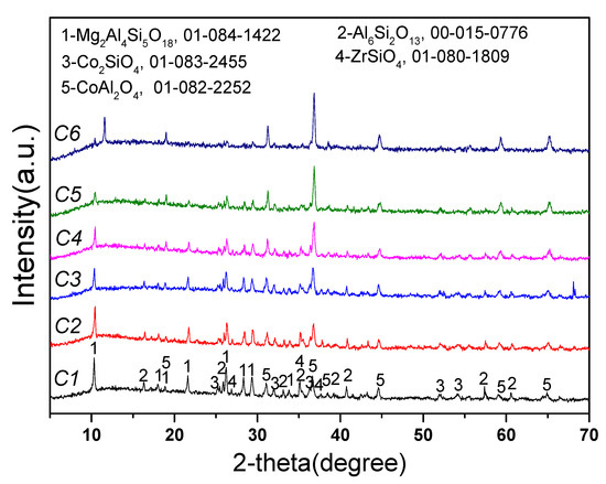 First, we crushed the new saggars to 200 mesh powder, mixed the powder with lithium carbonate and cobalt tetroxide, and calcinated the mixture in a muffle furnace at 1000 °C for 8 h to investigate the corrosion of the mullite–cordierite ceramic saggar during the production of LiCoO2 cathode materials. The experimental scheme is listed in the following Table 1.