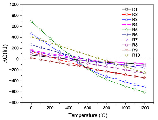 Figure 10 shows that at high temperatures, lithium carbonate appears to be a strong alkaline carbonate that can react with all components in saggar. All reactions may occur within the temperature range for the high-temperature synthesis of LiCoO2 cathode material. Among them, the reaction between Li2CO3 and cordierite phase was the easiest to occur and had the lowest activation energy at temperatures above 700 °C. In the case of sufficient Li2CO3, mullite, cordierite, and corundum particles can react with Li2CO3 to form lithium aluminate and lithium silicate. Reactions R1, R3, and R4 show that in the case of sufficient Li2CO3, most mullite, cordierite, and corundum particles can react with lithium carbonate to generate lithium aluminate and lithium silicate. The R2 chemical reaction formula shows that when the amount of lithium carbonate is small, the reaction of lithium carbonate with mullite forms a LiAlSiO4 phase. Reaction R4 indicates that lithium aluminosilicate further reacts with lithium carbonate to produce lithium aluminosilicate and lithium silicate. The ΔG of the different reactions shows that reaction R5 between cordierite and Li2CO3 is the most likely to occur, producing magnesium aluminum spinel, lithium silicate, and carbon dioxide. Reactions R6 and R7 show that when the content of lithium carbonate in the reactants is low, the solid products of ZrSiO4 and Li2CO3 are zirconia and lithium silicate. When the content of lithium carbonate in the reactants is high, the solid products of zirconium silicate and lithium carbonate are lithium zirconate and lithium silicate. The lithium aluminate products obtained by a high-temperature solid-state reaction exhibited two different phases, namely γ-LiAlO2 and α-LiAlO2. When the temperature is greater than 700 °C, α-LiAlO2 is transformed into γ-LiAlO2 [22]. Owing to the multiple cycles of high- and low-temperature conversion in the synthesis of the LiCoO2 cathode, the transformation reaction rate between γ-LiAlO2 and α-LiAlO2 was relatively slow, meaning different phases might coexist. When the synthesis temperature was above 1000 °C, γ-LiAlO2 occurred in the main phase of the lithium aluminate product. These results are consistent with our XRD analysis.