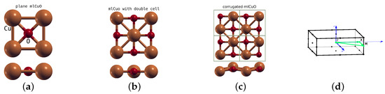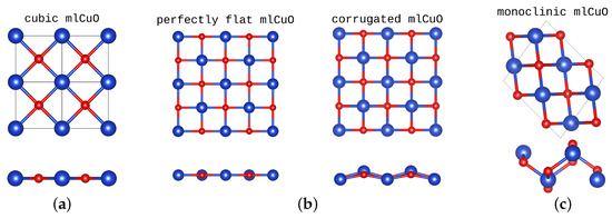 Copper oxides stand apart from other transition metal compounds. First of all, they attract much attention because of their high temperature superconductivity (HTSC) and already existing applications [1,2,3,4,5] as catalysts [6], photocells [7] and thin-film transistors [8]. is an exceptional member of the generally rocksalt family ( to ), as it deviates both structurally and electronically from others. Unlike other members of the transition oxides, which crystallize in the cubic rocksalt structure (with possible rhombohedral distortions), Tenorite (CuO) crystallizes in the lower symmetry monoclinic (C2/c) crystal structure [9], albeit the cubic crystal structure is also possible [10]. Thus far, the bulk compound has been thoroughly studied using ab initio calculations: DFT+U [11,12,13,14,15], DFT with hybrid functional [4] and Charge Transition Level Approach [16].