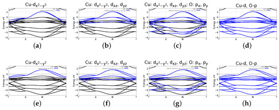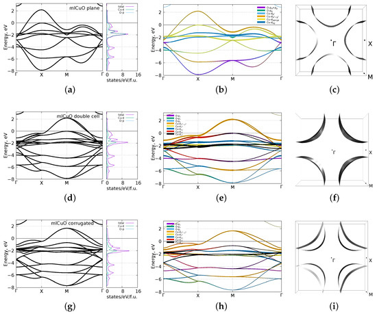 Figure 3 shows the DFT (GGA) band structures, the densities of states, bands with their orbital characters and the Fermi surfaces. The first row (a–c) of Figure 3 shows the results for the flat . The band structure in Figure 3a shows that there is an isolated set of bands in the range from eV to eV resembling typical -based HTSC . It has only the - and the - states. The electronic bands of the flat at the Fermi level are formed by the - states (with small addition of the hybrid - states) in consistence with the known results [11]. Note that there is a second band that almost crosses the Fermi level—it is only 0.02 eV lower. It includes the - states hybridized with the -. The Fermi surface has a hole pocket around the X point.