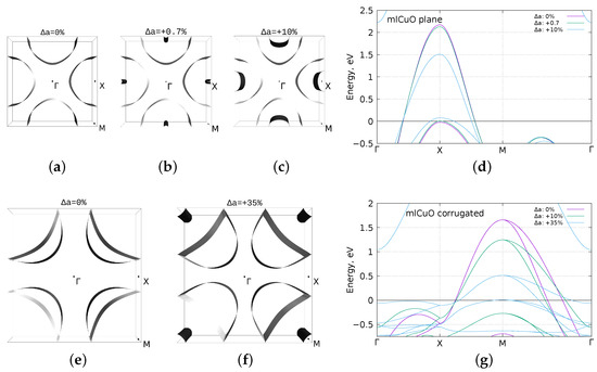 DFT (GGA) calculated Fermi surface with (zero strain), , and the band structure comparison for the flat (a–d); the Fermi surface with (zero strain), and the band structure comparison for the corrugated (e–g). Zero corresponds to the Fermi level.