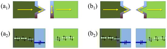Schematic representation of the wedge–edge (a) and wedge–wedge (b) configurations. The top panels (1) show a physical representation of electrons flowing through 2D layers due to a bias voltage or a temperature gradient and the electrons on the edge states, which do not couple to the former when their group velocity is perpendicular; the bottom panels (2) show the corresponding levels of the tight-binding model.