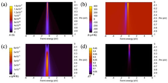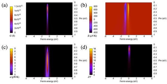 Electrical conductance (a), Seebeck coefficient (b), electronic thermal conductance (c) and figure of merit (d) as a function of the Fermi energy and the coupling parameter for the wedge–edge configuration. The temperature is 300 K.