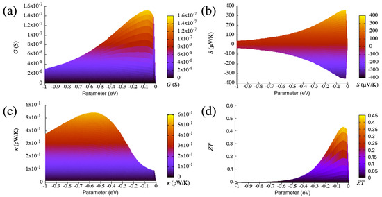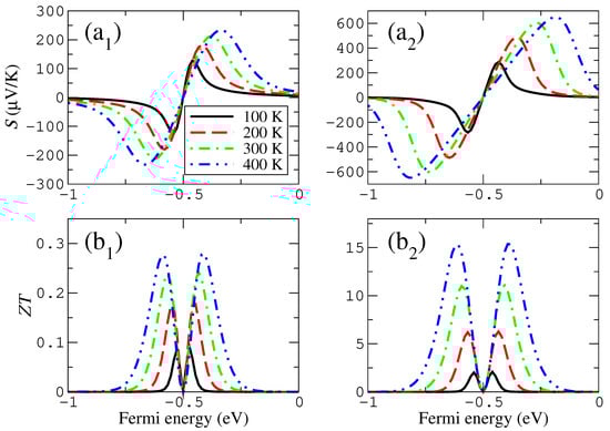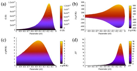The Seebeck coefficient and the figure of merit follow similar but not quite the same trends as the previous two quantities. Their evolution is shown in Figure 5, where it can be seen that, as a function of temperature, the maxima and minima of the Seebeck coefficient widen, separate and slightly grow (for smaller couplings, such as eV, the height is even kept roughly constant). The maxima of also widen and separate; however, their height clearly increases as a function of temperature. The primary feature responsible for such evolution is the Seebeck coefficient, whose magnitude is enhanced by the square in the expression of , while G and follow similar trends and due to the Wiedemann–Franz law give a contribution that is roughly proportional to (which cancels the T in the numerator or ).