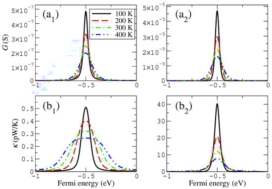 In particular, we calculated and show in Figure 4 and Figure 5 the change of the thermoelectric coefficients, grouping those that look similar (electronic and thermal conductances in Figure 4) and those that show more different trends (the Seebeck coefficient and the figure of merit in Figure 5) in a range of temperatures that can be accessed experimentally or can be meaningful for technological applications. Notice that these quantities are expected to clearly depend on temperature, since the transmission features around the Fermi level certainly feel the effect of the Fermi distribution function when the thermoelectric coefficients are calculated.