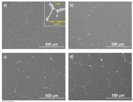 Figure 1 shows SEM micrographs of the ZX30 alloy in the different conditions tested. The as-cast alloy consists of α-Mg grains and large α-Mg + Ca2Mg6Zn3 eutectic phases located preferentially at the GBs (Figure 1a). After solution and aging treatments, the ZX30 alloy exhibits coarser and more equiaxed grains with a more continuous precipitates configuration at the GBs, and spherical particles within the grains are also observed (Figure 1b–d).