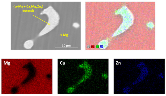 The evolution of hardness has been associated with the evolution of the microstructure. In the as-cast alloy, the distribution of α-Mg grains and large α-Mg + Ca2Mg6Zn3 eutectic phases were located preferentially at the GBs of the alloy, but the distribution was associated with uncontrolled cooling of the alloy, so it was not homogeneous. Figure 2 shows an EDS mapping analysis of an α-Mg + Ca2Mg6Zn3 eutectic precipitated in the alloy.
