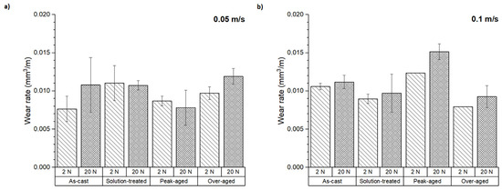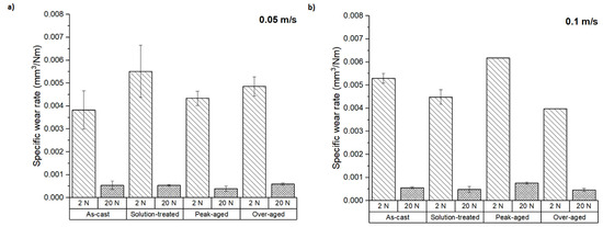 Figure 4 shows the specific wear rates of the tested samples as defined by Archard’s law (Equation (1)). In all conditions, the specific wear rate was strongly dependent on the applied load. At 20 N, the specific wear rate was lower at all the conditions studied, irrespective of the sliding speed used. The specific wear rate showed values lower than 0.007 mm3 N−1 m−1 at 2 N and values below 0.001 mm3 N−1 m−1 at 20 N. These results suggest that different wear mechanisms could have acted at the loads tested. At 2 N load, the as-cast and peak-aged samples at low speed and the solution-treated and over-aged conditions at high-speed showed the lowest specific wear rate values. These results are consistent with those observed in Figure 3.