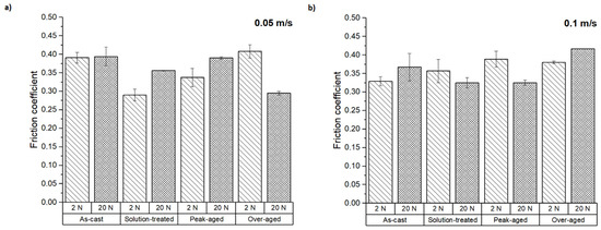 Friction coefficients at sliding speeds of (a) 0.05 m s−1 and (b) 0.1 m s−1.
