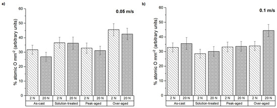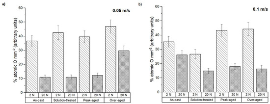 The average composition of the pin surfaces was determined by EDS to complement the analysis of the wear mechanisms. The atomic percentage of oxygen present on the surfaces of the samples after testing is represented in Figure 6. It was mainly independent of the test conditions, especially at the highest sliding speed. The over-aged condition showed the highest oxygen proportion in all cases.