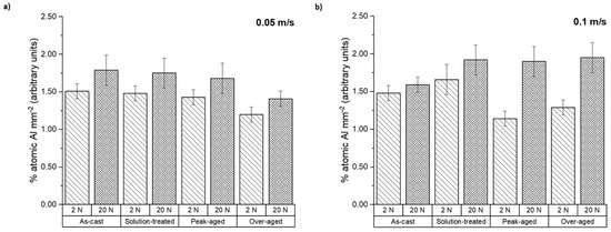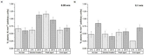 Furthermore, the presence of aluminum on the pin surfaces after testing was measured from the EDS spectra (Figure 7). It is worth mentioning that the tested samples do not contain aluminum in their composition. For this reason, the presence of aluminum indicates a material transfer from the counterbody to the tested pins during the dry sliding wear test. At the lowest sliding speed, the Al percentage ranged from 0.50 to 1.20%; the material transfer was considerably higher for the peak-aged condition and the solution-treated sample with an applied load of 20 N. However, at 0.1 m s−1, the transferred aluminum decreased, reaching an average value of 0.60% in all conditions.