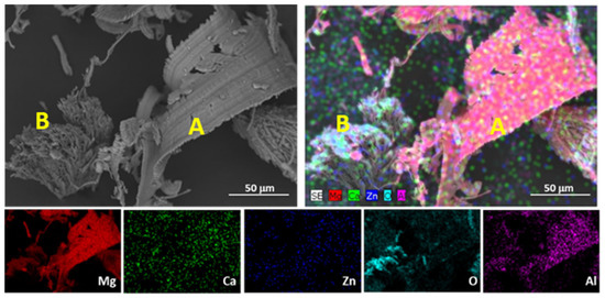 Figure 12 shows the wear debris generated because of the dry sliding test. It shows two different morphologies: the debris marked with A contained more Al, while the one marked with B had a higher O content. It is suggested that debris A, which has an elongated, curved, or spiral morphology, corresponds to the material removed from the counterbody during the wear test because the AZ31 counterbody contains Al in its composition. On the other hand, debris B refers to the oxide layer generated during the wear test. Debris B presents a sharp and irregular morphology resulting from the agglomeration of small, oxidized particles generated during the wear test. These particles could provide protection against wear to some extent.