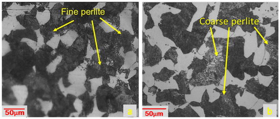 A cylindrical-shaped 50 mm dia and 150 mm long AISI 4340 alloy steel was used as the workpiece materials for the machining operation. It poses a Rockwell hardness value of 17 on C-scale (HRC) and chemical composition (by weight percentage) as 0.37% C; 1.65% Ni; 0.7% Cr; 0.6% Mn; 0.2% Mo; 0.15% Si; 0.04% S; 0.035% P and the rest of the balance Fe. For heat treatment (i.e., annealing) of the workpiece material an induction furnace Inductoheat 50-50R (from Inducotherm, Sanand, India) was used, having a maximum working temperature of 1200 °C. The workpiece samples were heated at 500 °C for 2 h and then left in the furnace to cool for 24 h, to increase ductility and made them soft to enhance machinability. A German-made Vicker’s microhardness tester (model: VMH-002 make: Walter UHL) was employed to determine the microhardness value before and after the annealing of workpiece samples by applying a force of exactly 200 g for a time span of 15 s as per the procedure prescribed in ASTM E92-82 [33]. Three indentations were made and their average value was used for the investigation. The average microhardness before heat treatment was 263 HV, the same has been reduced to 241 HV after the heat treatment. Figure 1 presents optical micrographs, showing the surface morphology of the workpiece sample before annealing Figure 1a and after heat annealing Figure 1b. It can be seen from the workpiece sample that the sample before heat treatment contained a fine perlite structure in which fine layers were present which opposes relative slipping to each other and hence higher hardness. The fine perlite structures were converted to coarse perlite structures after heat treatment which causes grain refinement, reduces hardness, and increases ductility [34].