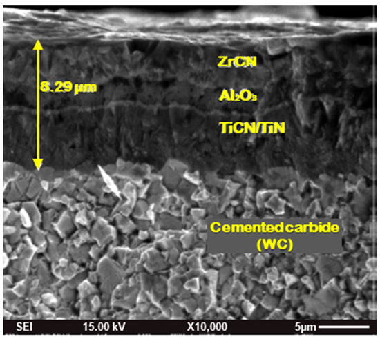 Turning experiments were performed on lathe machine NH-22 (from Hindustan Machine Tools, Bangalore, India) having a speed range of 40 to 2040 rpm and longitudinal feed range from 0.04 to 2.24 mm/rev. In the present investigation, a CVD multilayer (TiN/TiCN/Al2O3/ZrCN) coated cemented carbide cutting insert with ISO designation of SCMT120408 and grade of KCP30 (manufactured by Kennametal, Pittsburgh, PA, USA) was used for the turning operation. The cutting insert was mounted on a tool holder with an ISO designation of SSBCR2020K12. The combination of the cutting insert with the tool insert holder resulted in the cutting geometry of −6° - −6° - 6° - 6° - 15° - 75° - 0.8 (i.e., −6° back rake, −6° side rake angle, 6° end clearance angle, 6° side clearance angle, 15° end cutting edge angle, 75° approach angle and 0.8 mm nose radius). Figure 2 displays an SEM image of the cross-section morphology of coated carbide tool, showing the various coating layers on cemented carbide tool substrate. Some preliminary turning experiments were performed on workpiece materials by varying cutting speeds (6, 8, 11, 16, 23, 27, 30, 39, 66, 77, 86, 112, 146, 190, 247, and 320 m/min) as per the standard speed available on the lathe machine using doc at 0.1 mm and feed at 0.1 mm/rev. The wear behavior of the coated carbide tool was assessed on the basis of allowable flank wear (VBmax) limits of VB up to 0.3 mm (as per ISO 3685 i.e., maximum flank wear width occurring at the tip of the tool). To derive the interaction, which governs the cutting forces and machined surface roughness, it is insightful to correlate with the resulting wear behavior. Based on these experiments, a cutting speed ranging from 112 to 247 m/min was found to be an optimum cutting speed for further experiments. Using the findings of the preliminary experiments, 16 experiments were designed and conducted using the Taguchi L16 technique by varying the three most important parameters at four levels. The various levels of selected machining variables in these experiments are listed in Table 1. All experiments were performed with a new cutting edge and the machining was continued for the duration of 10 s.