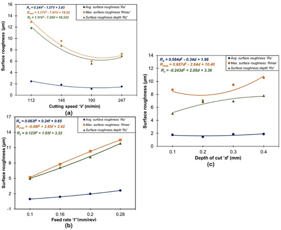 Figure 4 and Figure 5 show the impact of machining factors (V, f, d) on surface quality parameters (Ra, Rmax, Rz) and machining forces (Fx, Fy, Fz). Regression analyses were employed to obtain the predictive models for each response on experimental values and their curve fitting. ANOVA was used to test the significance of the predictive models by using MINITAB 20 software. The probability value (i.e., the p-value) corresponding to each equation was found below 0.05 which indicated the statistical significance of experimental data at a 95% confidence level. The results of ANOVA are provided in Table 3.