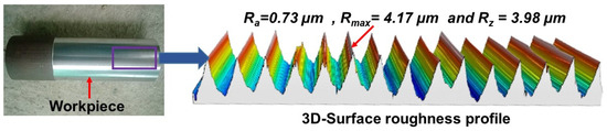 From Figure 4 and Table 3, feed rate was found to be one of the most influential parameters contributing 51.8% for Ra, 42.7% for Rmax, and 44.3% for Rz. This result is anticipated with the very well-known theory of metal cutting that for a specified or stated nose radius, the theoretical surface roughness (Ra = 0.032) is principally a function of feed rate [36,37]. The second most influencing parameter was observed in cutting speed with a contribution of 51.8% for Ra, 39.6% for Rmax, and 37.8% for Rz. Although, the parameter cutting speed does not present a statistically significant role on surface roughness (especially, Ra) because its p-value is larger than 0.05; however, it is a lone contribution (30.93%) and cannot be ignored. This is in good agreement with previously published works [38,39,40]. The error contributions have shown a very minor impact on roughness parameters (Ra, Rmax, and Rz,) with 13.4%, 8.5%, and 11.1%, respectively. These small values indicate no errors in the measurement of responses. Increasing the cutting speed, surface roughness parameters starts decreasing and attains a minimum value at a speed of 190 m/min and thereafter surface roughness starts increasing. At a lower cutting speed, a built-up edge (BUE) developed which sticks over the carbide insert and results in more surface roughness; whereas as soon as the cutting speed starts increasing (up to 190 m/min), the temperature at the chip-tool interface and the time required for welding of chip material over the tool is inadequate. This inhibits the formation of the build-up-edge and results in a decrease in surface roughness [41]. Surface roughness parameters start slightly increasing the cutting speed beyond 190 m/min due to the worn cutting insert. Two major factors (lateral side flow arising from plastic deformation of machined surface and chatter due to vibration) influenced the roughness at a high level of cutting speed (247 m/min), as reported by Mahapatra et al. [42]. In the case of increasing feed rate on all surfaces, roughness variables start increasing and attain high values at a feed of 0.28 mm/rev. At a low value of feed, the formation rate of BUE and tool wear was less, and as the feed increases BUE formation and cutter feed marks increase, which results in more surface roughness. In addition, Suresh et al. [43] reported that with the increased axial feed, the thrust force increases accordingly, provoking unusual vibration and high heat generation that corresponds to poor surface finish. Similarly, the increase in depth of cut causes the 0.1 to 0.2 mm surface roughness parameters to decrease; thereafter, they start increasing and attain the highest value at 0.4 mm. This is due to an increase in cutting depth which causes more material removal from work materials, high heat generation at the tool-chip tool, and generation of feed (cutter) marks. Figure 6 depicts the 3-D profile of the best-finished surface workpiece sample.
