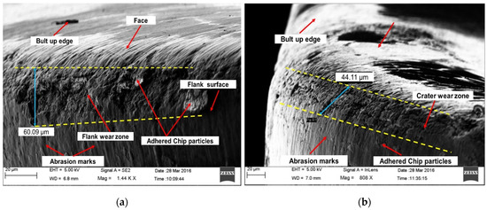 Figure 8 depicts a surface micrograph of a worn-out insert of a tool at a cutting speed of 247 m/min, feed rate of 0.1 mm/rev, and depth of cut of 0.4 mm for flank wear. It can be noted from (i) Figure 8a that the flank face, rack surface, and nose of the insert are severely worn at high speed and doc. The maximum flank wear was 60.09 µm. The presence of deep plowing grooves and edges on the flank and crater surface indicates the abrasion mode of wear of the insert [21]. Chip particles also adhered to the flank and crater surface which causes nose wear due to the welding of chips; and (ii) Figure 8b that maximum crater wear of 44.11 µm was found by SEM. Increasing the depth of cut causes more material to be removed from the work surface as it passes over the rack face of the tool, and it causes the removal of material from the rack surface because of its high temperature. This results in crater wear and causes flank wear. It is evident from Figure 9 that at low cutting speeds develop built-up-edge formation to a great extent which may be due to sufficient available time for microchips to adhere to the tool face through the welding effect (developed by friction and heat at the tool-chip interface) [48]. Additionally, Ahmed et al. [49] reported that a low thermal conductivity and high work hardening tendency of work materials during machining are also considerations for BUE formation.