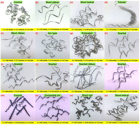 After performing a series of cylindrical turning trials under various cutting conditions, the produced chips were collected and categorized as per ISO 3685 standard for quantitate evaluation. The nature of the chips produced during machining highly influences the machining quality and machinability aspects. Figure 10 represents the various size and shapes of chips produced from the machining operations. Chip thickness increases for every value of speed, doc, and feed. However, it attains the maximum value at a speed of 247 m/min, an axial feed of 0.28 mm/rev, a cutting depth of 0.4 mm. Figure 10 depicts photographs of chips obtained under several cutting speeds and feeds. It is seen that lower chip thickness appears to decrease with feed and speed, which contrarily decreases the cutting forces as well as tool vibration and, thereby, results in better surface quality. Undeformed chip thickness increases with feed, as stated. The generation of the saw-tooth chips depends directly on the undeformed chip thickness; in particular, an increase in the thickness of the undeformed chip contributes to a larger saw-tooth.