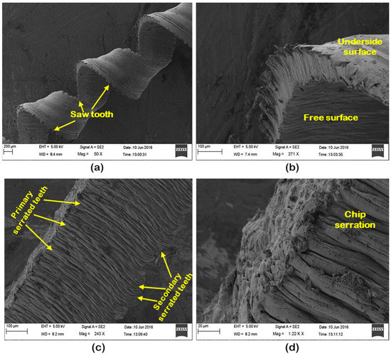 Figure 11 depicts the chip morphology of AISI 4340 alloy steel produced by dry turning under various machining settings (conditions). Serrated chips are noticed in all the cutting conditions. Plastic deformation, cyclic cracks, and shear localization are the three primary attributes of chip serration. It can be noted from Figure 11a,b that the chips were gradually scalloped with the increase of axial feed and doc at a cutting speed of 247 m/min. Such implies that the saw tooth chip takes more and more form as a result of continuous cyclic cracking produced by intense shear bands. Both top and bottom surfaces of the chip were confirmed with SEM observation. Plastic deformation is marked at the top surface of the chip, which resulted in a continuous rough surface mostly with ridges and scallops. In the case of the underside surface of the chip, which was sliding upon the tool, it is considerably smoother with fine-long scratches. It is seen from Figure 11c,d that the chip serrations are moving above the whole width of the chip at varying machining conditions. Distinct saw tooth elements have appeared over the upper-free edge, which is marked as primary serrated teeth, and in certain instances, bigger coagulated features developed at the lower-tool tip-side edge of the chip, which is marked as secondary serrated teeth. The free (upper) surface of the cutting chips produced under cutting conditions; v = 146 m/min, f = 0.10 mm/rev, and d = 0.2 mm, is shown in Figure 11e,f. The SEM image depicts the severity of chip serration, including the appearance of the rough surface and irregularly arranged lamellar structure with minute corrugations. This is due to lateral flow and shear cracks that initiate at the free surface of the workpiece and proceed downward along a shear plane towards the cutting edge and subsequently to the rake surface. Based on the above result and discussion, the combination of speed at 146 m/min, axial feed as 0.1 mm/rev, and doc as 0.4 mm is recognized as an optimum parametric combination merger that yields a good surface finish (in experiment no. 5), whereas the combination of V = 112 m/min, d = 0.10 mm, f = 0.10 mm/rev is identified as an optimum combination which yields low cutting forces and minimum flank wear. However, the parametric combination of V = 146 m/min, d = 0.10 mm, f = 0.16 mm/rev is identified as the optimum condition for the production of low chip thickness.