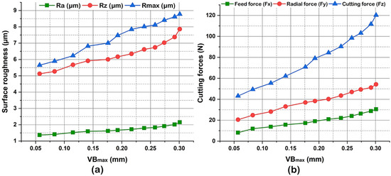 Figure 12 illustrates the influence of tool flank wear on machined surface finish and cutting forces. It is recorded from Figure 12a that a flank wear (VBmax) value of 0.057 mm corresponds to the values of surface roughness criteria Ra, Rz and Rmax of 1.371, 5.122, and 5.652 µm, respectively and the values of machining force components (Fx, Fy, Fz) are 43.15 N, 20.57 N and 8.17 N, respectively (refer, Figure 12b). When the flank wear attains 0.3 mm, the increase of surface roughness criteria Ra, Rz and Rmax is 57.18%, 53.49%, and 55.25%, respectively. The analysis concludes that surface roughness is closely related to and proportional to flank wear. That means any progress in flank wear indicates some degradation of the machined surface quality. Similar results can be found in the literature [20,50]. Consequently, when the flank wear reaches the value of 0.3 mm, a total rise in the cutting force components of 273.81%, 163.58%, and 178.72% was recorded for feed force, radial force, and cutting (tangential) force, respectively. The major cutting force is the tangential force. This synthesis confirms that the increase in cutting forces is in direct connection with the degradation of the cutting edge of the tool. Figure 13 illustrates the various machinability characteristics for the evaluation of machining performance under varying cutting speeds assessed in this study. It is seen that the enhanced machined surface morphology, higher chip thickness, developed prominent serrated chip, and increased tool wear were obtained when the machining was performed under a dry environment at a high cutting speed.