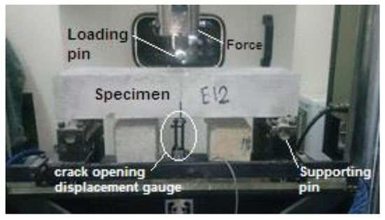 Fracture energy is defined as the amount of energy required for crack growth per unit area along the ligament. The fracture energy of the manufactured concrete specimens was measured based on the Japan Concrete Institute’s standard [31]. In this research, the geometry of specimens was as shown in Figure 2. Next, using a three-point bend test, the diagram of load–crack mouth opening displacement (CMOD) was obtained. The area under the curve was measured, and fracture energy GF was calculated using Equations (1) and (2).