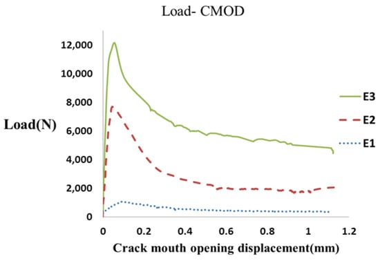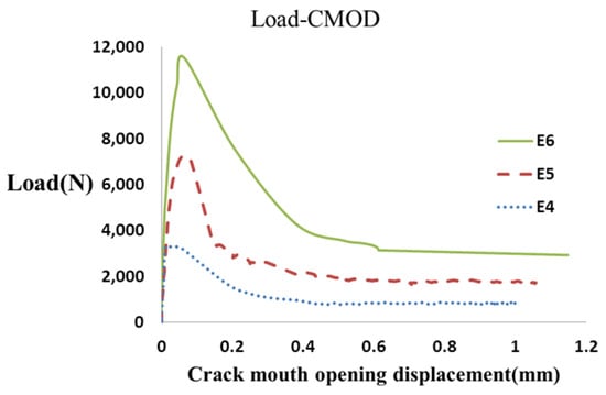 Figure 7 shows an example of the load–CMOD curve of the notched fiber-reinforced concrete specimens with different widths and a 0.4% volume fraction.