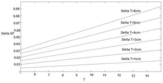 As shown in Table 6, the coefficient T2 was equal to 0.00051. Therefore, if the change in fracture energy for width (T), holding other factors fixed, is considered, the equation would show the fracture energy change value by width change (which is plotted for changes from 1 to 6 cm in Figure 8). These diagrams can be used for optimal design and economic evaluation. However, considering fiber dosage coefficients, each 1% increase in the amount of fiber increases the fracture energy by 0.26. To investigate the effect of two variables, width and fiber dosage, on fracture energy, considering that the units of these two variables are not the same, the effects of these variables cannot be compared with each other according to their coefficients. For this purpose, the coefficients must first be standardized so that it is possible to compare. The values of these standard coefficients are presented in the last column of Table 6. As can be seen, the higher the value of the fiber dosage coefficient, the greater effect of the fiber dosage relative to the width variable (T) on the fracture energy.