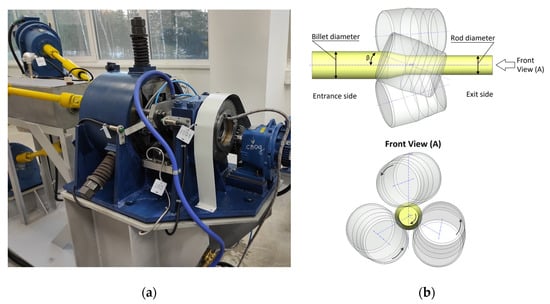 Computer simulation was performed in the QForm 3D software package. The three-dimensional model included three rolls and the initial billet and corresponded to the scheme of RSR, as shown in Figure 1b.