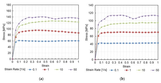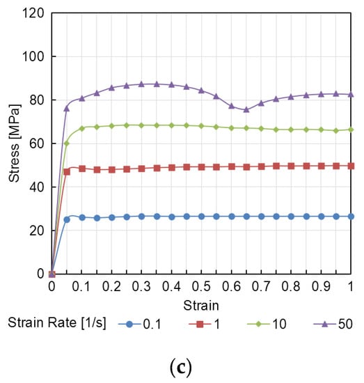 In addition, based on the rheological properties of the workpiece material, the stress–strain state is calculated (Figure 3). To describe the rheological properties of the Al–Zn–Mg–Ca–Fe alloy, experimental data were used []. The flow stress is calculated as a function of temperature T, strain rate , and deformation ε (4):