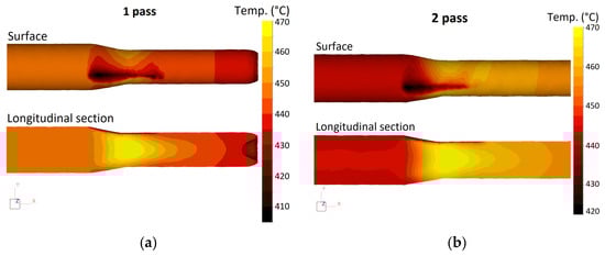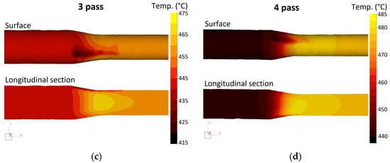 Based on the simulation results, the analysis of the temperature and stress–strain state of the rod in the process of RSR was carried out. Figure 4 shows the distribution of the temperature field of the rod in each pass. As can be seen, in the process of RSR, a complex formation of a temperature field in the volume of the rod occurs, which is associated with several factors. On the one hand, the billet is cooled in air and during contact with the rolls, which have a lower temperature. On the other hand, heat is released due to the work of deformation.