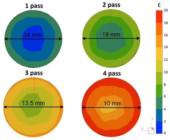 Figure 5 shows the distribution of the effective strain in the cross-section of the rod after each pass. This parameter can be used to comprehensively characterize the effect of the deformation process on the material properties. According to previous studies [,], the RSR process achieves a high value of effective strain on the rod surface due to the severe shear deformations. In this case, a characteristic gradient distribution of strain across the radius of the rod can be seen. The maximum values are formed at the surface of the rod and uniformly decrease in the direction of the axial zone.