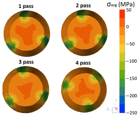 Figure 6 shows the distribution of average stresses in the cross-section of the rod during the RSR process, which also reflects the gradient nature of the deformation during the RSR. In the axial zone of the rod, slight tensile stresses that have a positive value of 20–50 MPa are observed. Near the surface, at the area of contact with the work rolls, compressive stresses (from −150 to −200 MPa) are located.