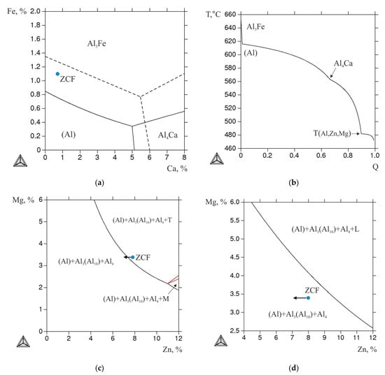 Calculated fragments of Al–Zn–Mg–Ca–Fe phase diagram (position of experimental alloy CZF is shown): (a) liquidus projection at 8% Zn and 3.3% Mg; (b) dependence of mass fraction of solid phases (Q) versus temperature (Sheil–Gulliver simulation) for alloy ZCF; (c) isothermal section at 0.8% Ca, 1.1% Fe, and 450 °C; (d) isothermal section at 0.8% Ca, 1.1% Fe, and 500 °C.